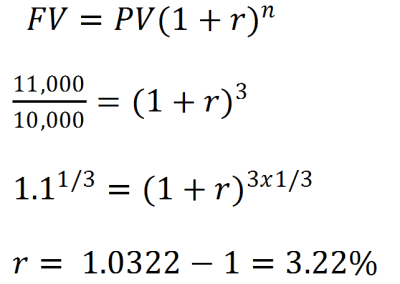 If the transaction goes as per plan, Islamic bank would earn a profit of $1,000, which is a 10% return on its invested funds. If the customer delays payment for 3 years or 5 years, then the Islamic bank can only charge price of $11,000. In case, the payment of $11,000 (Future Value or FV) is received after 3 years, the return on investment ‘r’ would turn out to be 3.22% as illustrated below.