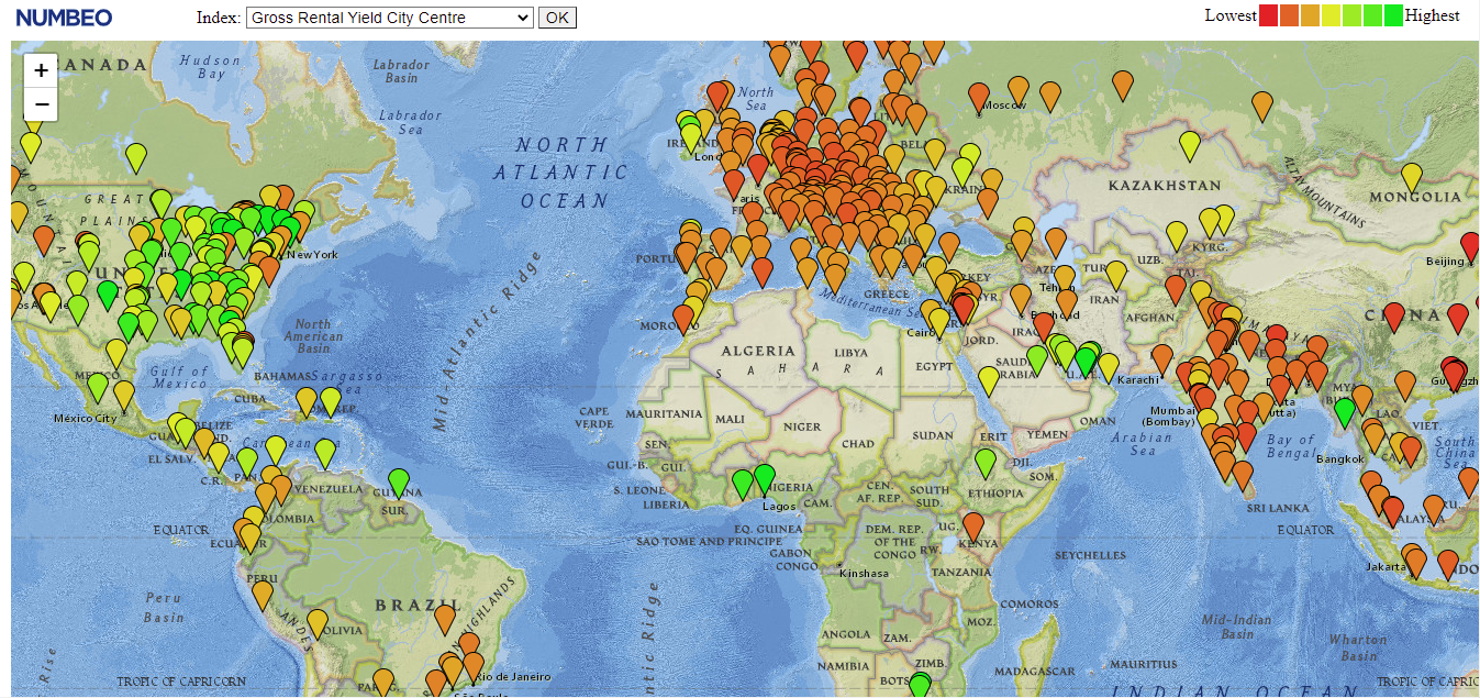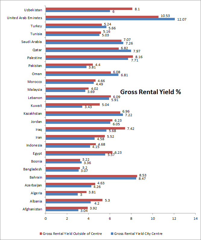 In real estate, rental yields vary from 3% per annum to 6% in most of the Muslim majority countries as can be seen in the graph below which takes data for 2020 from Numbeo.