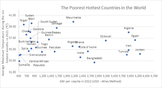 Figure below illustrates the poorer countries that are facing the hottest climate. They face hostile climate conditions which hamper their productivity, health and agility.