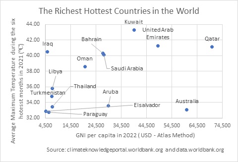 Now, let’s take a look at the other graph which illustrates the 14 hottest richest countries in the world. Saudi Arabia, Qatar, Kuwait, United Arab Emirates, and Oman have average maximum temperatures between 39℃ and 43℃. These high numebrs do not create havoc in the lives of people given the rich living standards. The electricity prices are one of the lowest in Kuwait ($ 0.033 per kWh), Qatar ($0.036 per kWh), Bahrian ($0.045 per kWh), and Oman ($0.052 per KwH). Having spent a big part of my childhood in Jeddah, Saudi Arabia, I can recall our 24/7 consumption of air-conditioners. The affordability of electricity in Saudi Arabia in the 90s was our bastion from the blazing sun outside.